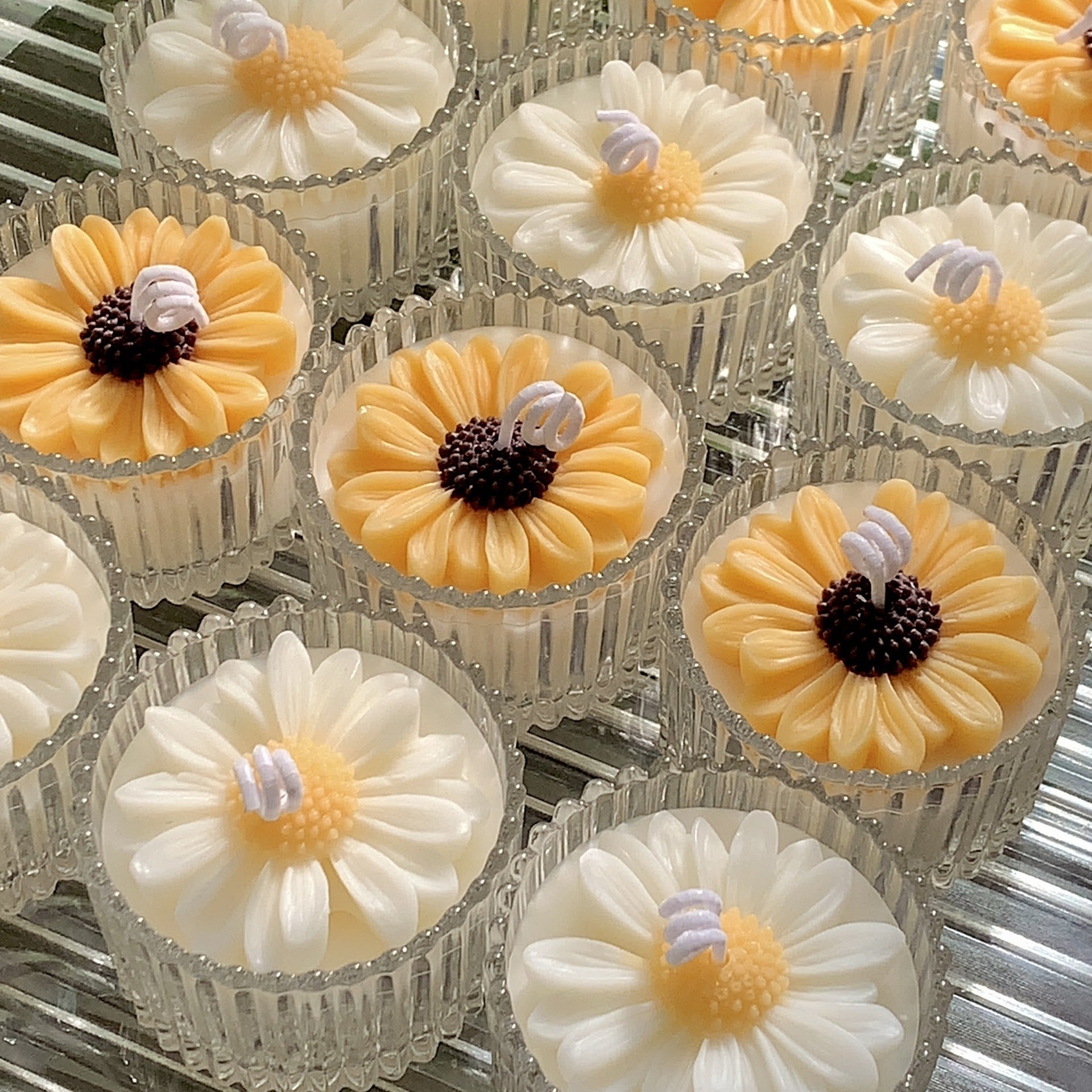 Bring nature's charm into your home with this hand-poured daisy flower candle, beautifully set in a clear glass cup. Each candle is crafted from natural soy wax with delicate floral detailing, making it both a cozy aromatherapy piece and a stunning decorative accent.