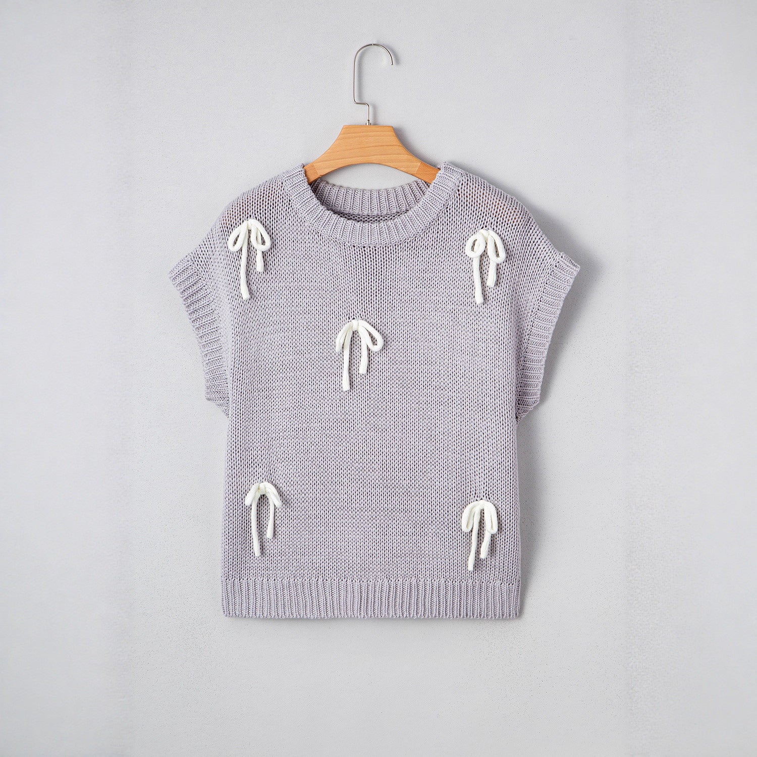 Add a playful twist to your wardrobe with this Knit Sweater Top with Bow Details. Designed in a soft, breathable knit, this pullover tee blends cozy comfort with chic style. The bow appliques on the shoulders and front give it a feminine, trendy look that's perfect for dressing up or down.