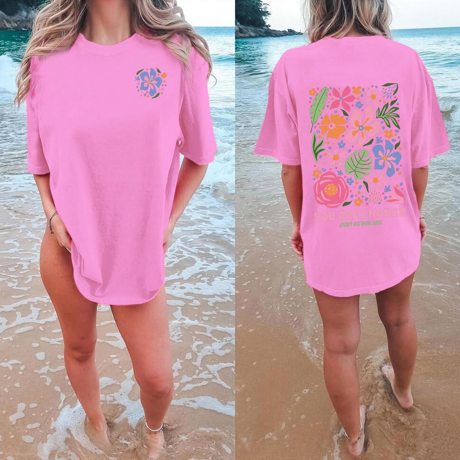 Brighten your wardrobe with this oversized floral graphic t-shirt featuring a vibrant garden-inspired back print and the empowering message "You Are Enough - Just As You Are". Made from soft colored cotton, it's designed with a relaxed, loose fit that works perfectly as a casual tee, beach cover-up, or everyday statement piece.